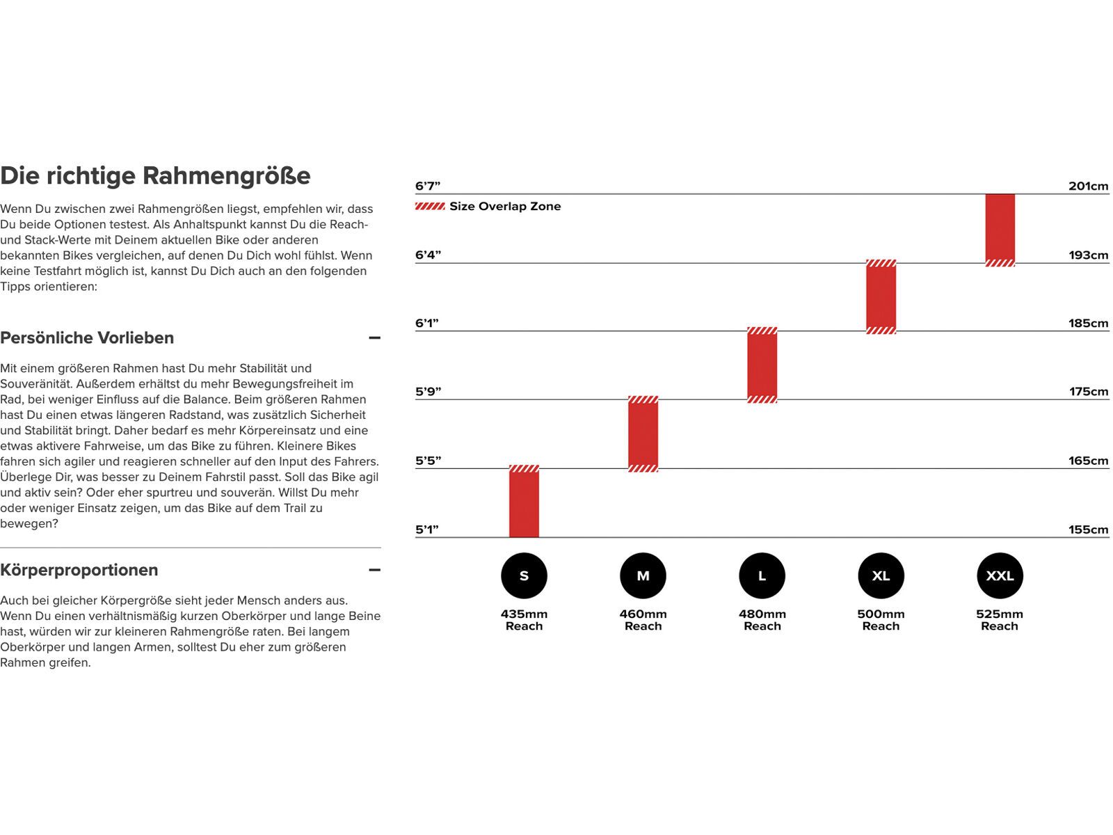 - Die richtige Rahmengröße: Wenn Du zwischen zwei Rahmengrößen liegst, empfehlen wir, dass Du beide Optionen testest. Als Anhaltspunkt kannst Du die Reach- und Stack-Werte mit Deinem aktuellen Bike oder anderen bekannten Bikes vergleichen, auf denen Du Dich wohl fühlst.