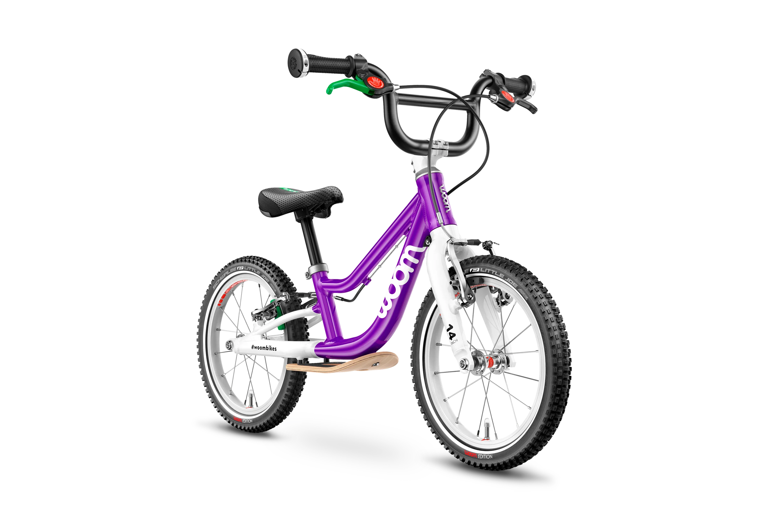 - Reifen: 14 x 1,4″ Schwalbe Little Joe – woom Edition mit reflektierenden Streifen für gute Sichtbarkeit